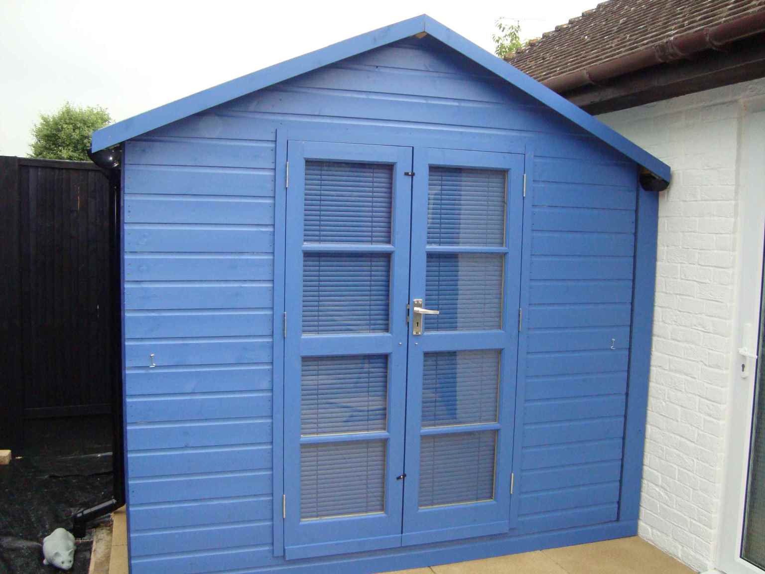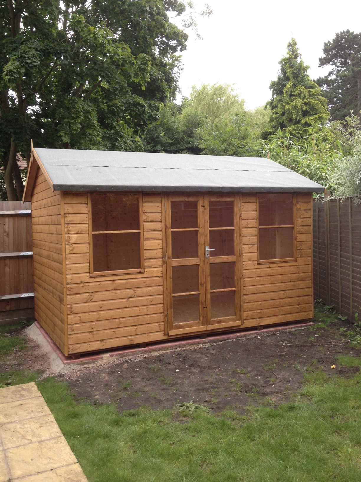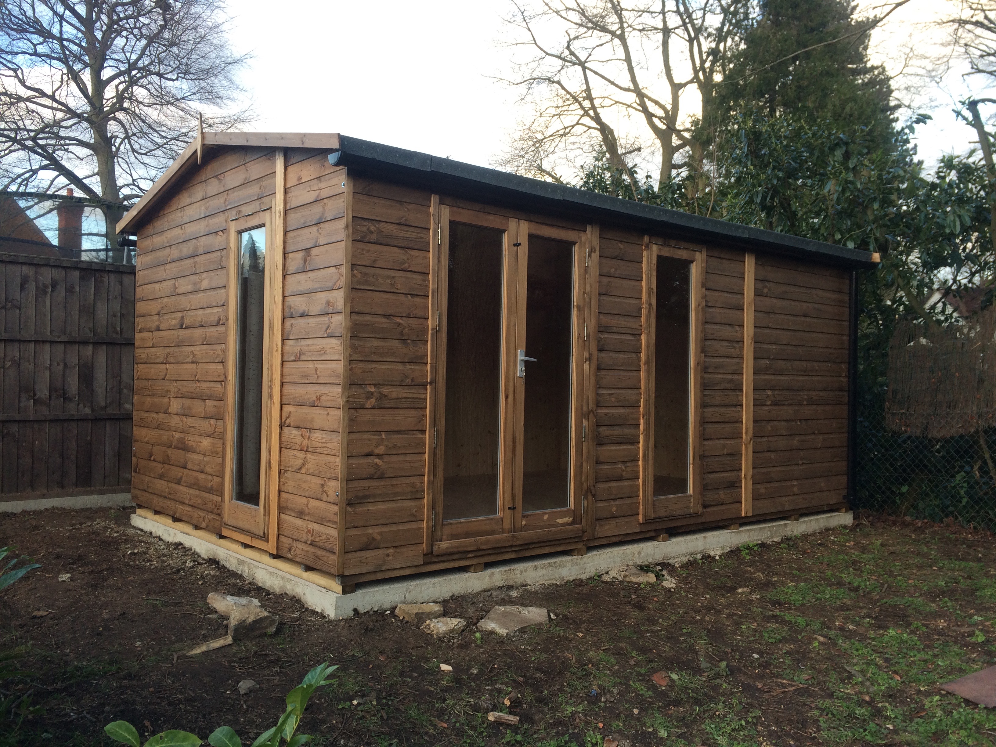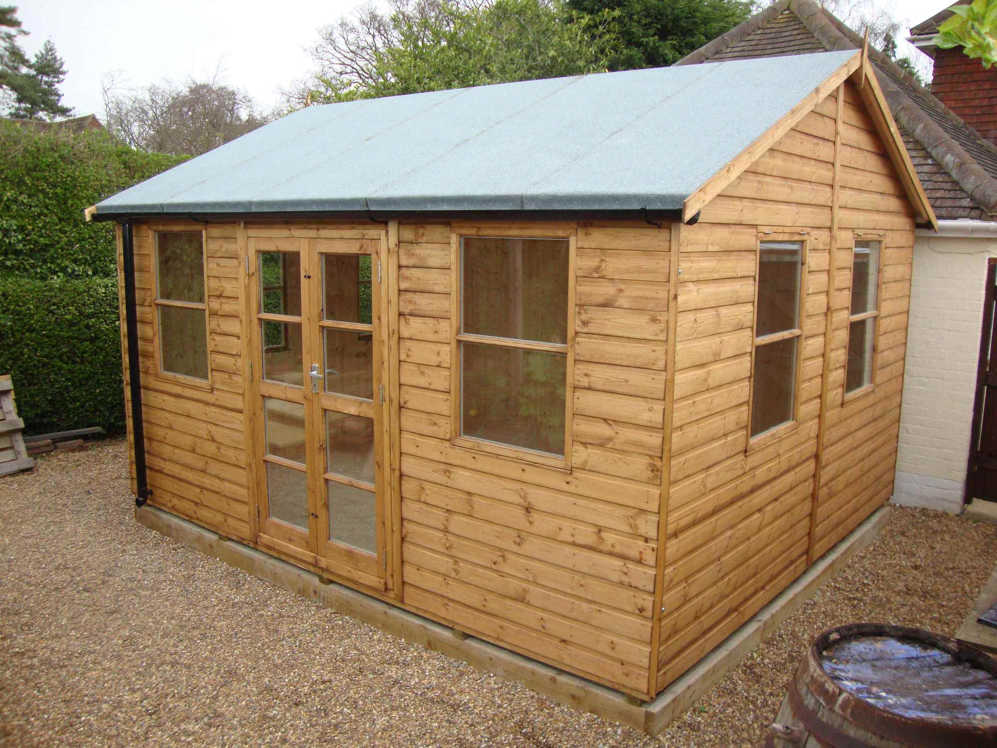 Deluxe Studio 14×10, Heavy Torch-On Felt, 6mm Ply Lined and Insuulated, Gutter & Downpipes, Shades Finish.
