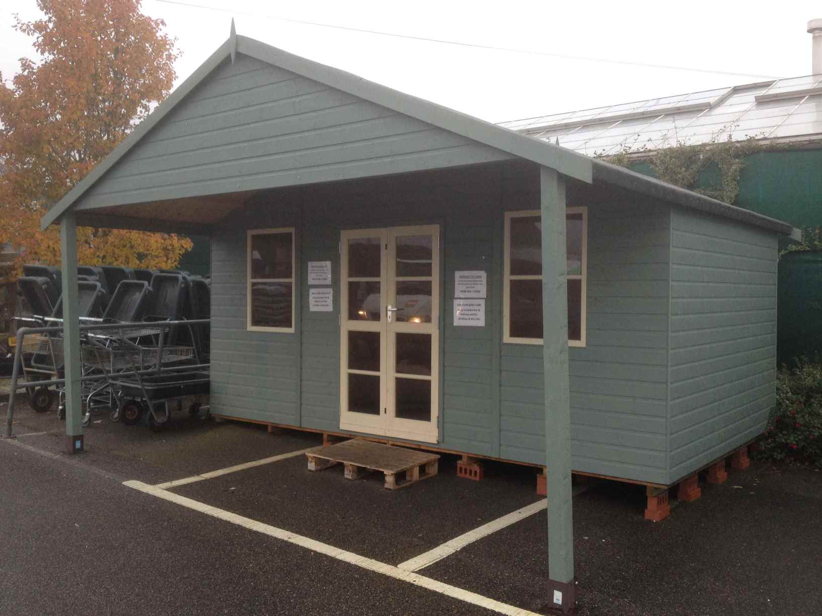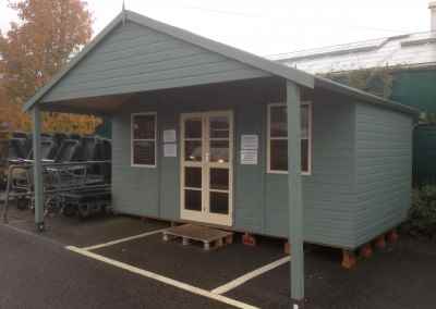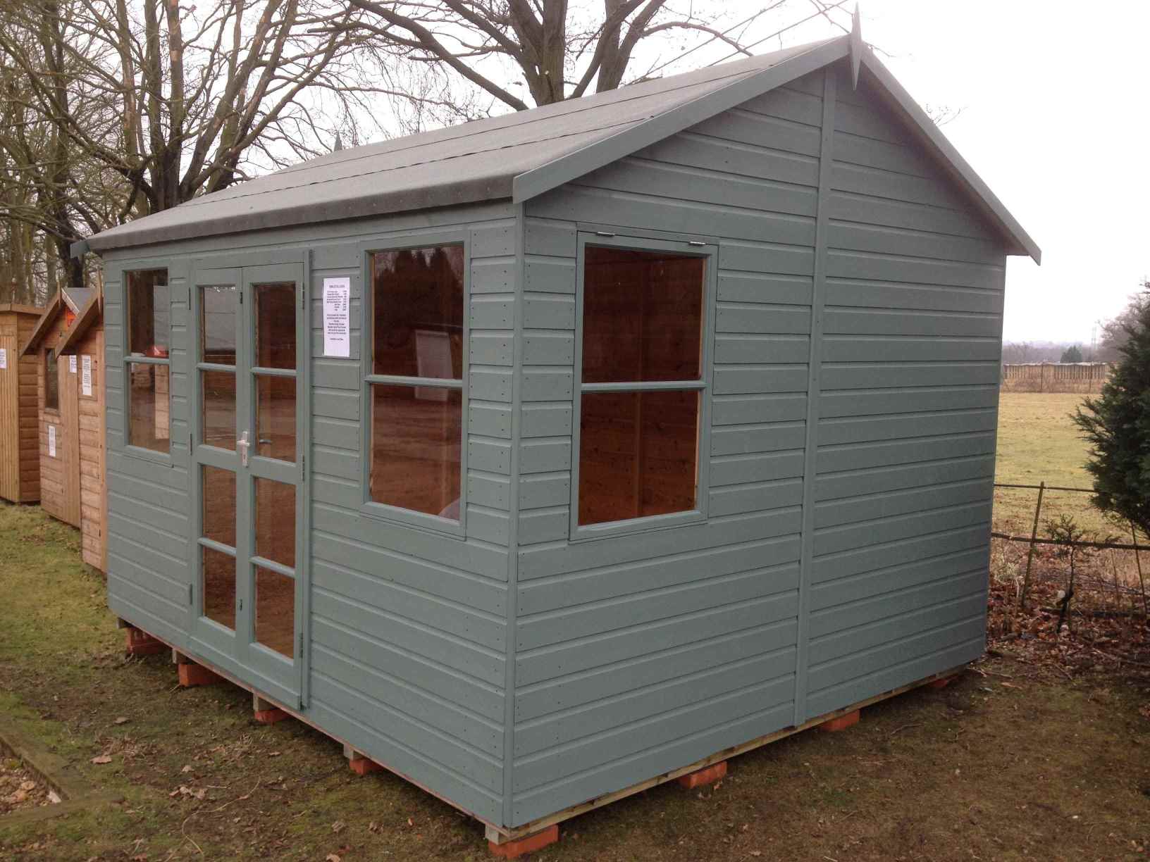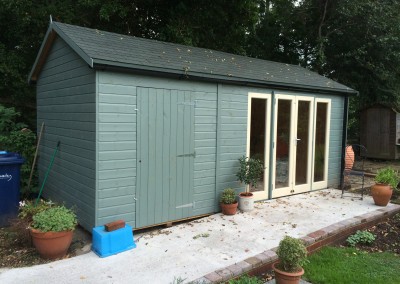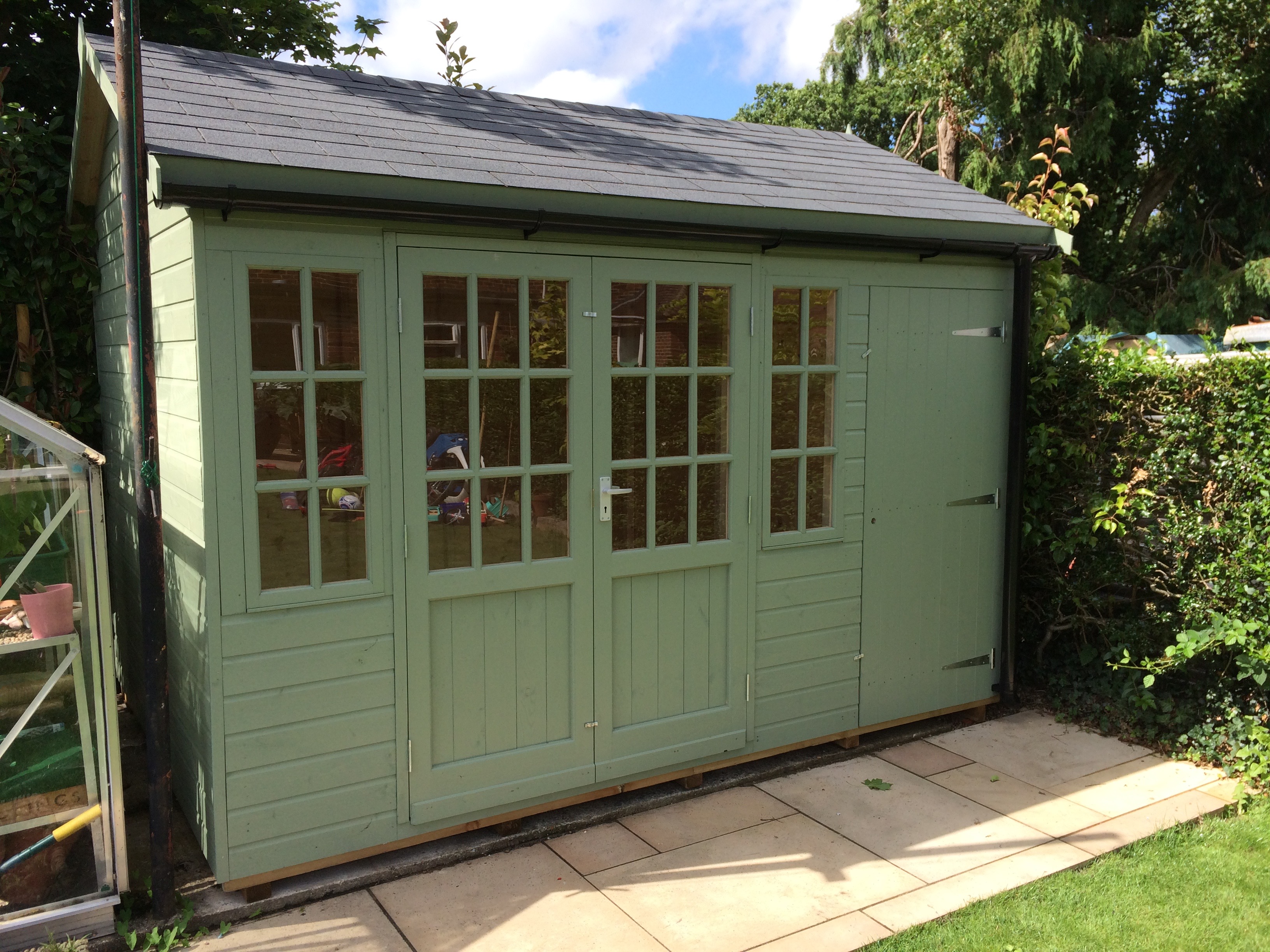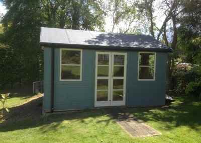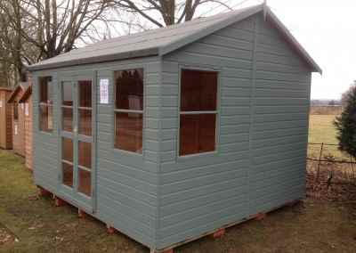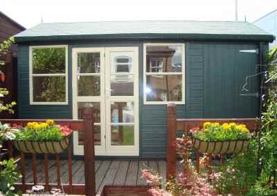Deluxe Studio 14×10, Extra Height, Richmond Doors, Double Glazed Sash Windows, Increased Front Roof Overhang, Felt Tiled Roof and Wild Thyme Finish