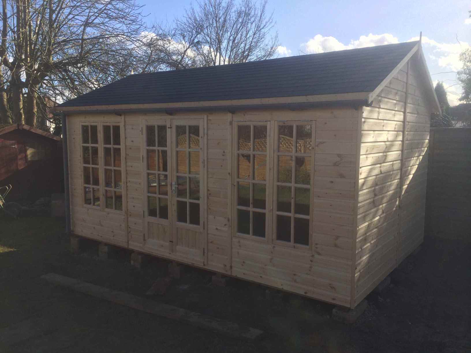 Deluxe Studio 14×12 Extra Height, Richmond Doors, Sash Windows, Felt Tiled Roof, Guttering and Silver Birch Finish
