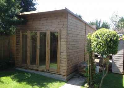 Deluxe Pent Bespoke 20×7, Extra Height, Reverse Roof Slope, Richmond Doors, Sash Windows, Partitioned Shed Compartment, Ply Lining with Insulation, Guttering and Willow Finish
