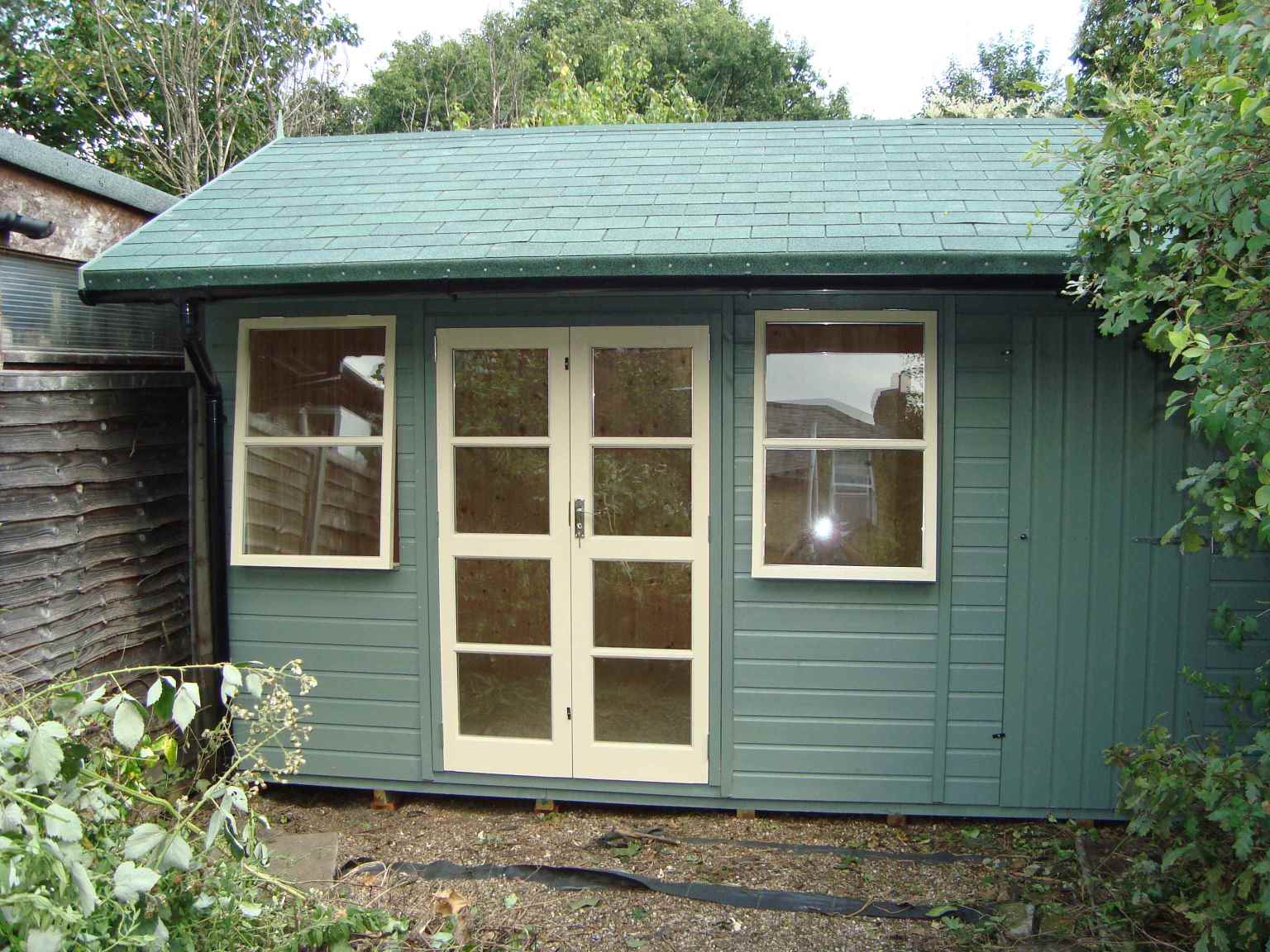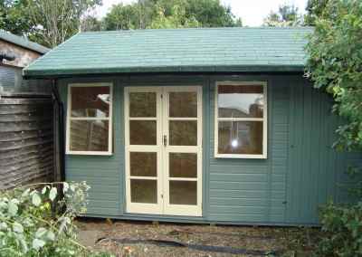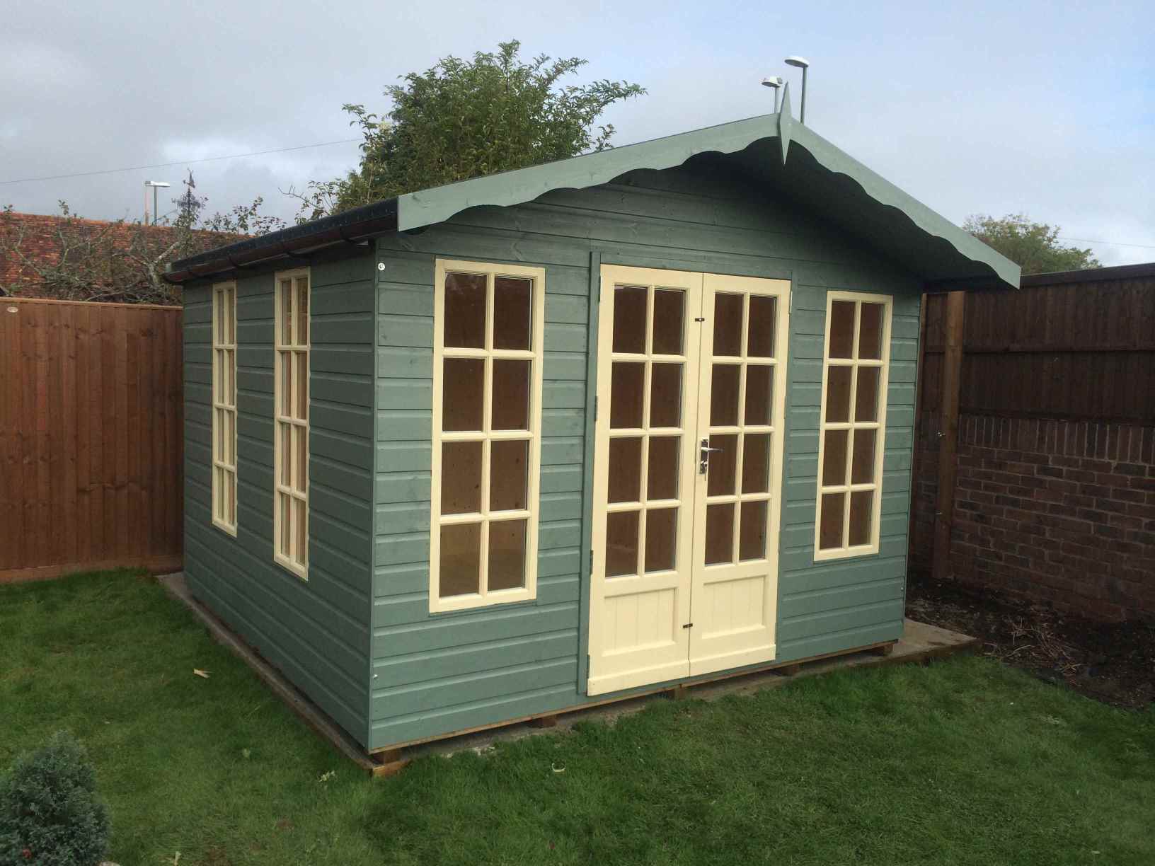 Deluxe Studio 14×10, Extra Height, Richmond Doors, Double Glazed Sash Windows, Increased Front Roof Overhang, Felt Tiled Roof and Wild Thyme Finish