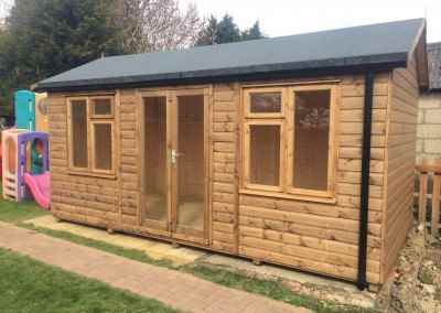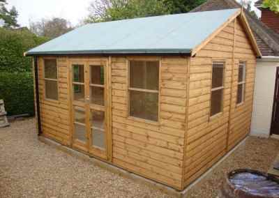 Heavy Duty Workshop 22×20, ‘L’ Shaped with Felt Tiled Roof, French Doors and Joinery Windows