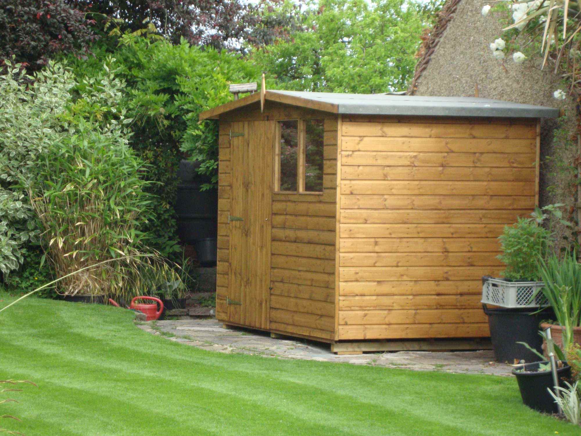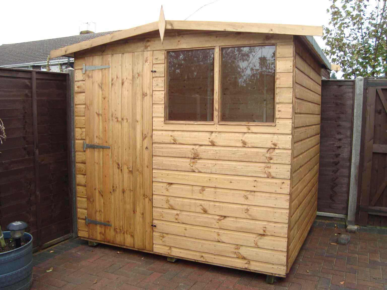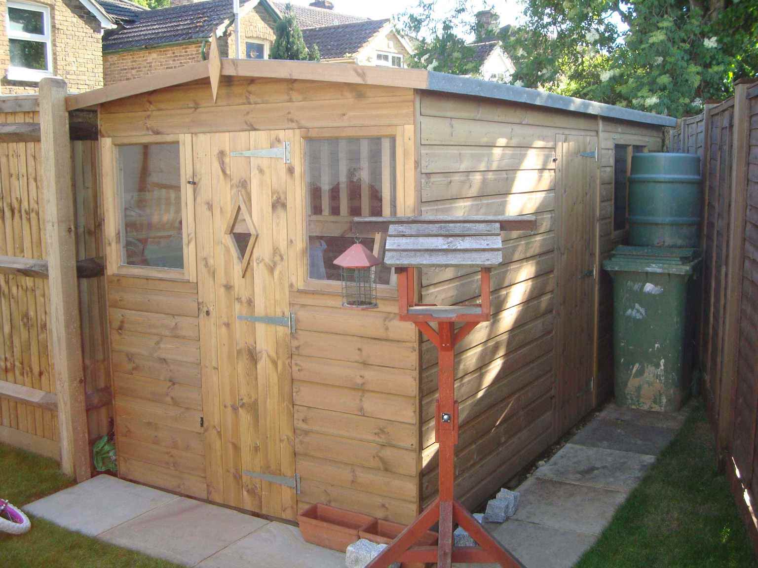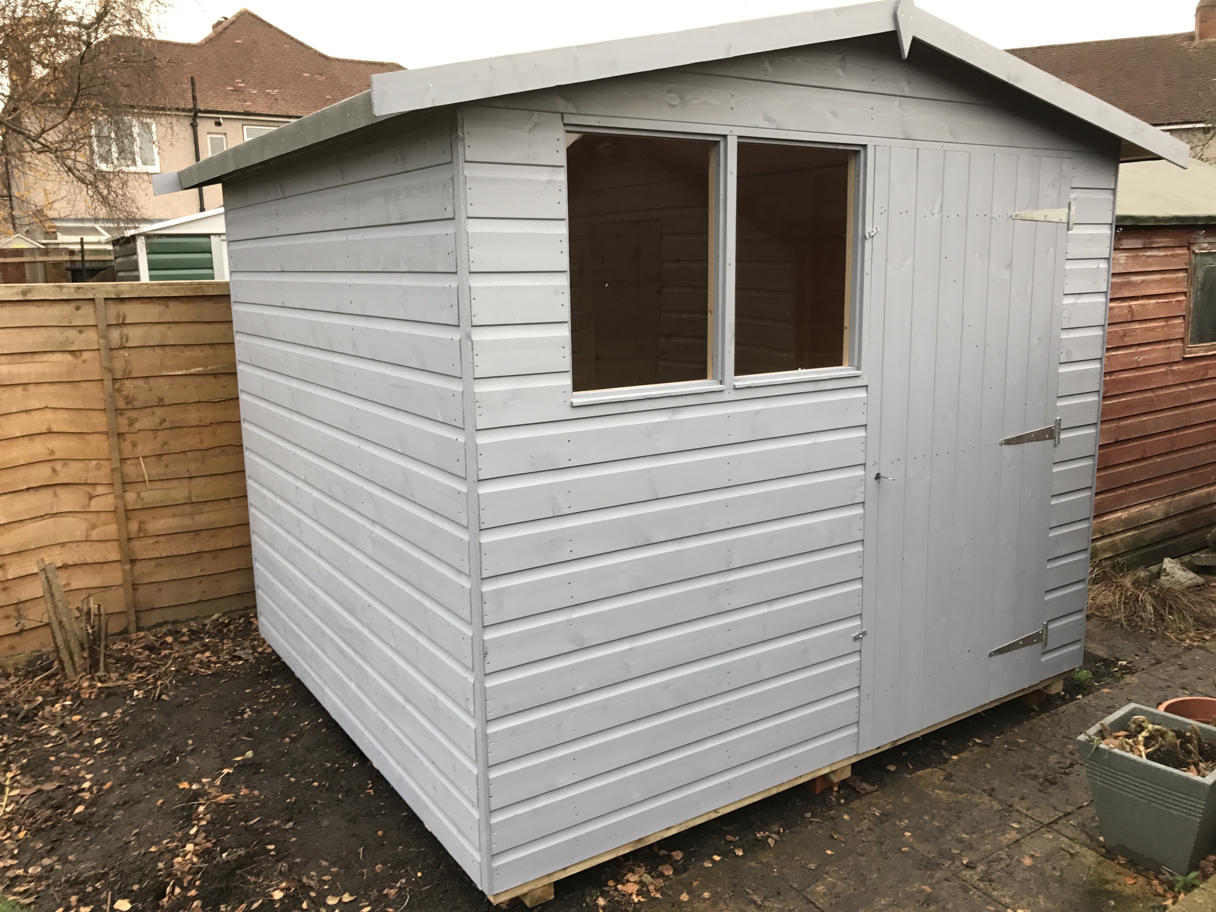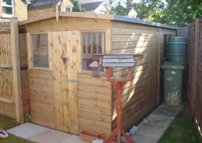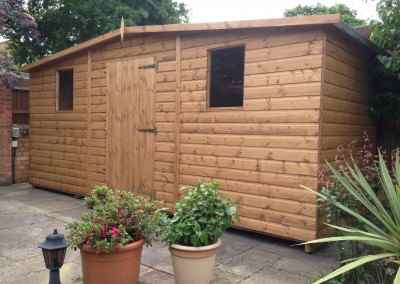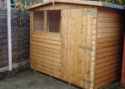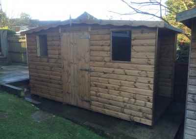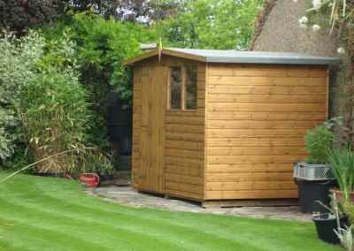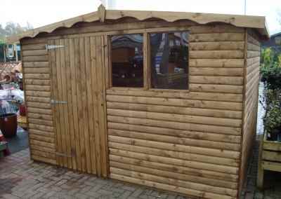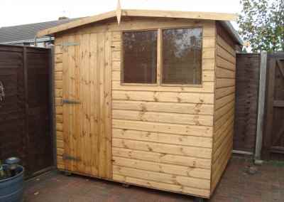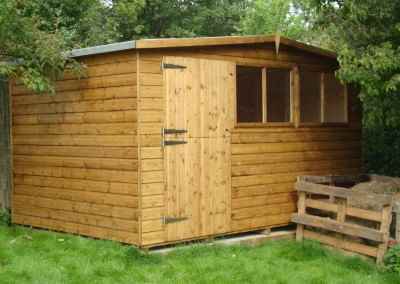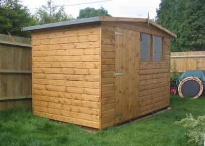 Shallow pitched transverse gable, 6’ to eaves, door and fixed windows in front gable. Lay-outs to suit.