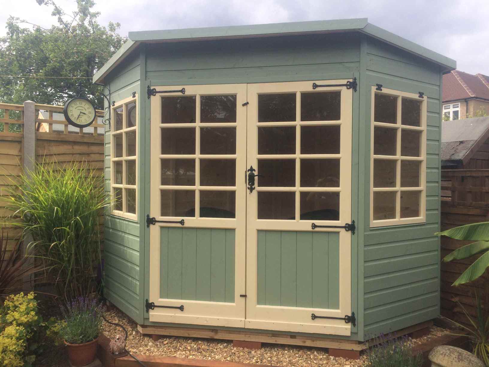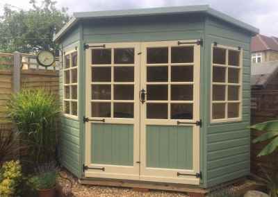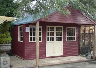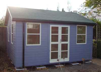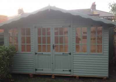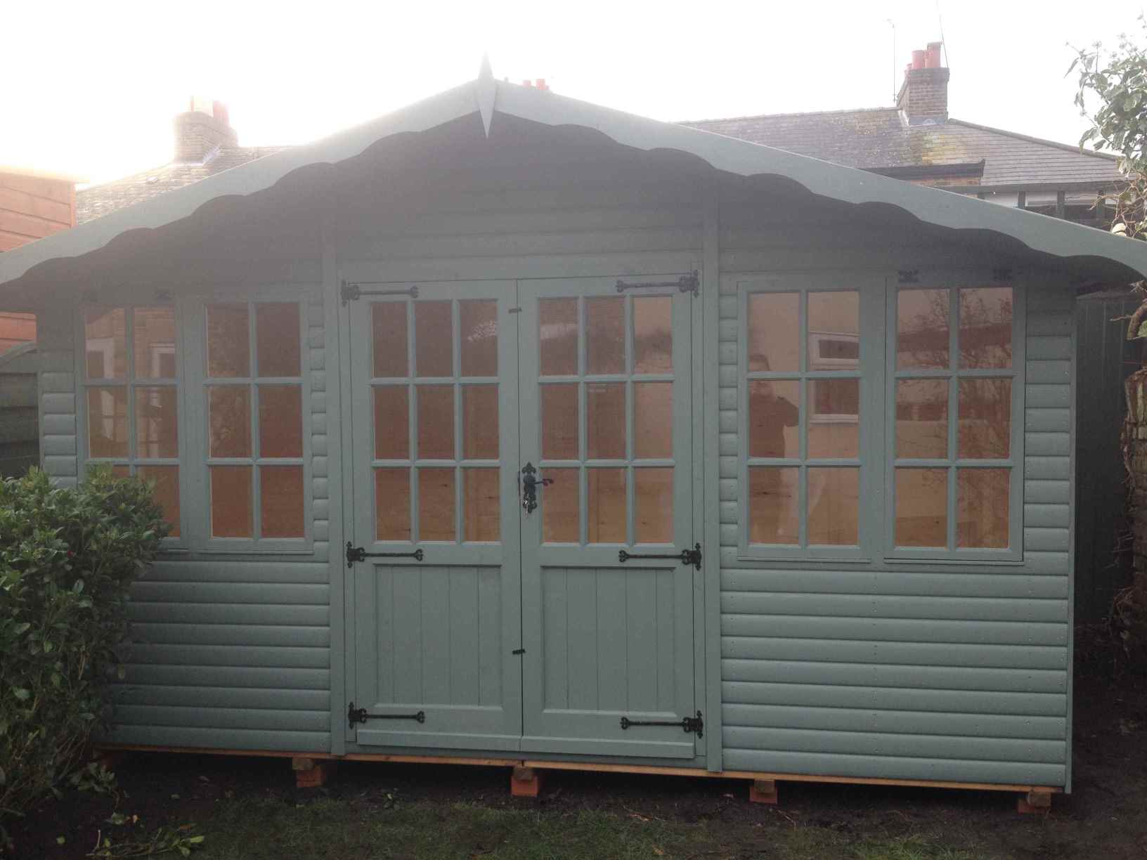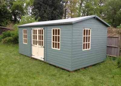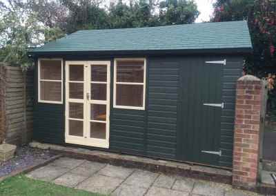 Deluxe Studio 14×10, Extra Height, Richmond Doors, Double Glazed Sash Windows, Increased Front Roof Overhang, Felt Tiled Roof and Wild Thyme Finish