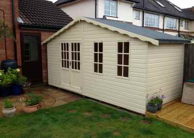 Deluxe Studio 14×12 Extra Height, Richmond Doors, Sash Windows, Felt Tiled Roof, Guttering and Silver Birch Finish